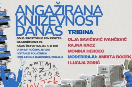 Gošće tribine su Olja Savičević-Ivančević, Monika Herceg i Rajna Racz s kojima se razgovara o granicama i mogućnostima angažiranog pisma: postoji li danas angažirana književnost i kako je prepoznati, je li nužno povezana s aktivizmom, zašto se zazire od riječi angažman, kako sve tekst može biti angažiran.