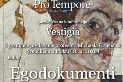 Uz potporu Odsjeka za povijest FF-a, MH, LZ-a i Srednje Europe, uredništvo časopisa studenata povijesti Pro tempore organizira Međunarodnu konferenciju za mlade istraživače Vestigia 15.-17.4. Tema: Egodokumenti. Bit će 23 izlaganja iz Hrvatske i drugih europskih zemalja te predavanje prof. Michaëla Greena sa Sveučilišta u Łódźu. Pročitajte više
