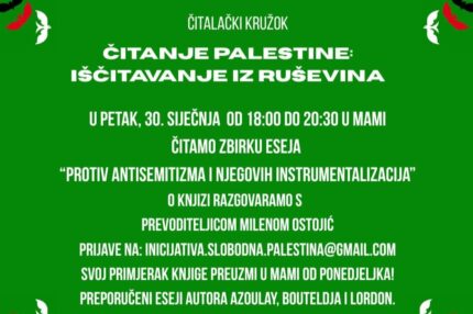 Čitanje Palestine: iščitavanje iz ruševina novi je ciklus čitalačkog kružoka Inicijative za slobodnu Palestinu. Kružoci se odvijaju svakog zadnjeg petka u mjesecu u MaMi. Pročitajte više
