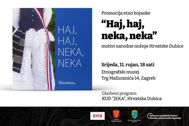 Promocija etno bojanke Haj, haj, neka, neka održat će se u srijedu, 11. rujna u 18 sati u Etnografskome muzeju (Trg Mažuranića 14). Etno bojanka vezana uz motive narodne nošnje Hrvatske Dubice predstavlja dio baštine a promovirat će je predsjednica KUD-a Jeka Katica Marin, recenzent prof. dr. sc. Tvrtko Zebec i voditeljica odjela baštine Kulturno-povijesnog centra Sisačko-moslavačke županije Martina Mladenović. Glazbeni nastup KUD-a Jeka obogatit će promociju, kao i sudjelovanje dječje sekcije KUD-a, lijepih modela u nošnjama prikazanih u etno bojanci.