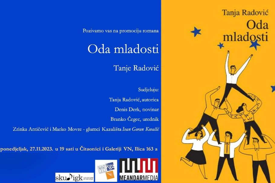 Promocija romana Oda mladosti spisateljice Tanje Radović, održat će se u ponedjeljak, 27. studenog u 19 sati u Čitaonici i Galeriji Vladimir Nazor (Ilica 163a). Knjigu će, uz autoricu, promovirati Denis Derk, novinar, Branko Čegec, urednik i izdavač (Meandarmedia) te glumci Kazališta Ivan Goran Kovačić – Zrinka Antičević i Marko Movre.